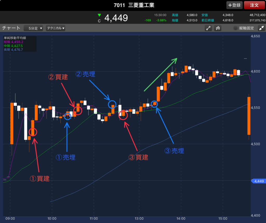 この日3度のトレードのうち、最も反省すべきトレードが②です