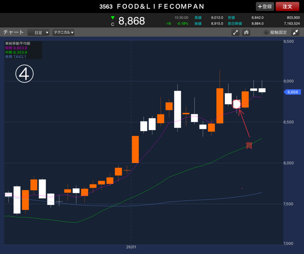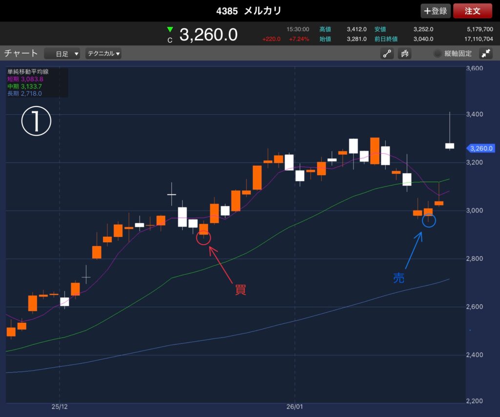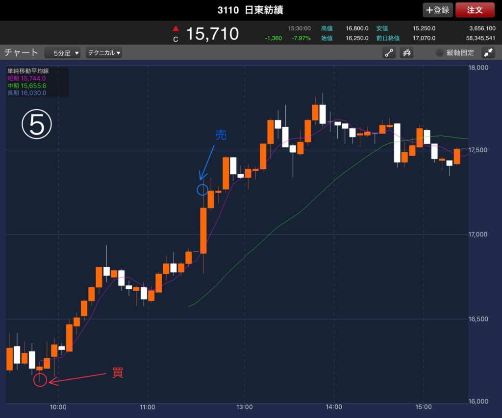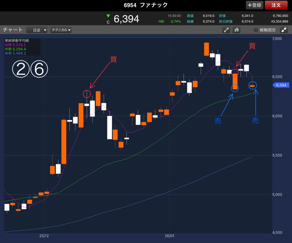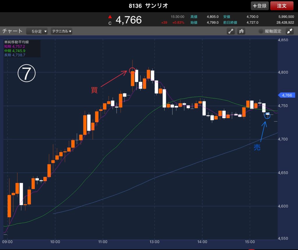 その後、再度上昇したタイミングで、再度買って、決算前までに上昇したタイミングで売ろうと思っていたら、逆に損失を出してしまいましたね(⑥)