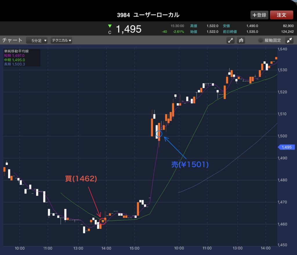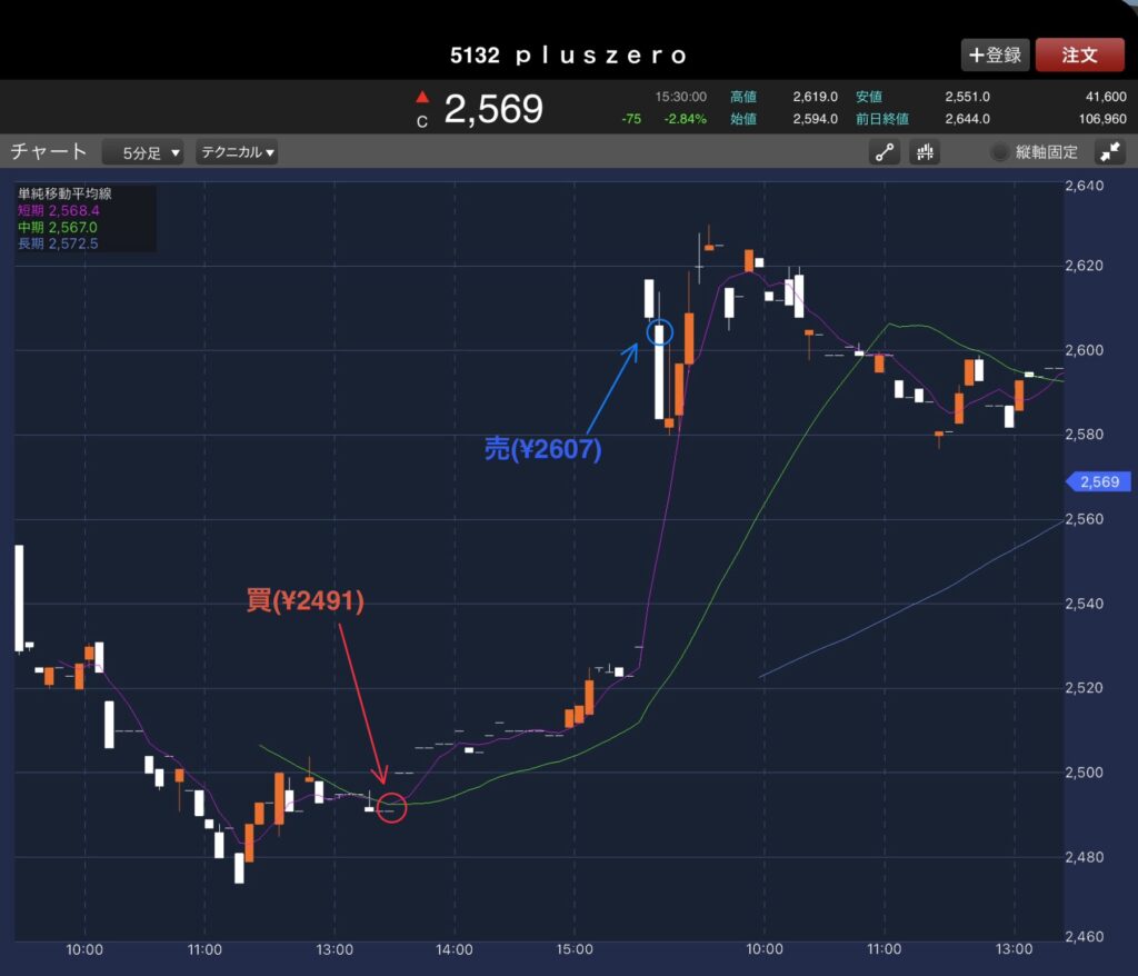 全部で5回売買して、2勝3敗でした